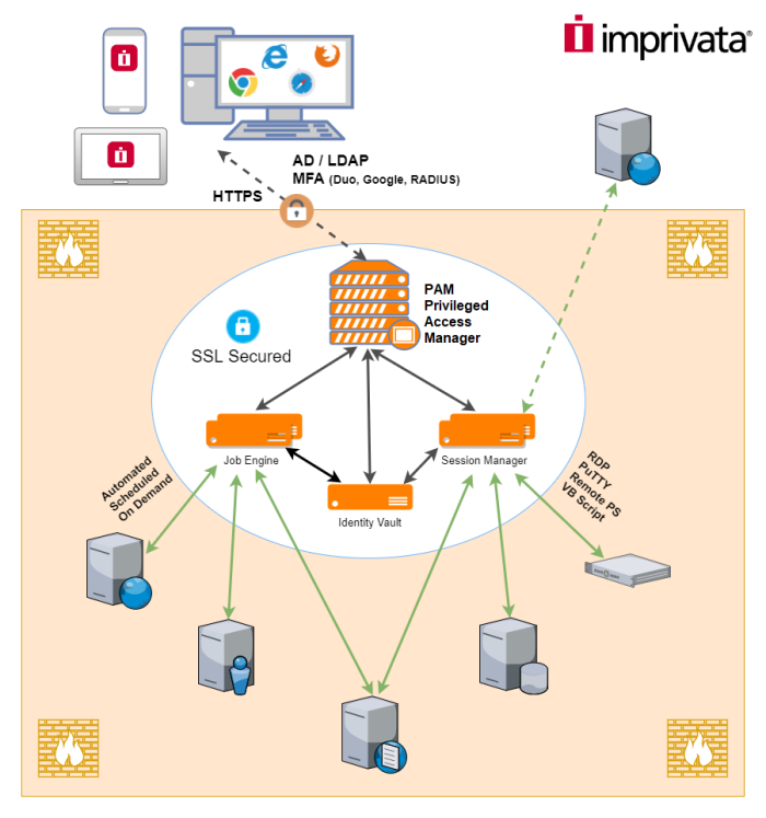 PAM sits within the firewall in its own SSL secured network.